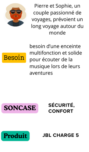- Confort : La JBL Charge 5, avec sa fonction powerbank, permet à Pierre et Sophie de charger leurs appareils en déplacement. Cela leur offre un confort supplémentaire lors de leurs voyages.
