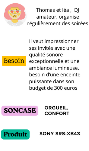 - Orgueil : La Sony SRS-XB43, avec sa puissance de 100W et ses lumières intégrées, est capable de produire un son qui peut remplir une pièce entière et créer une ambiance lumineuse pour la soirée. Cela permettra à Thomas de montrer à ses invités qu’il a le meilleur équipement pour animer la soirée.